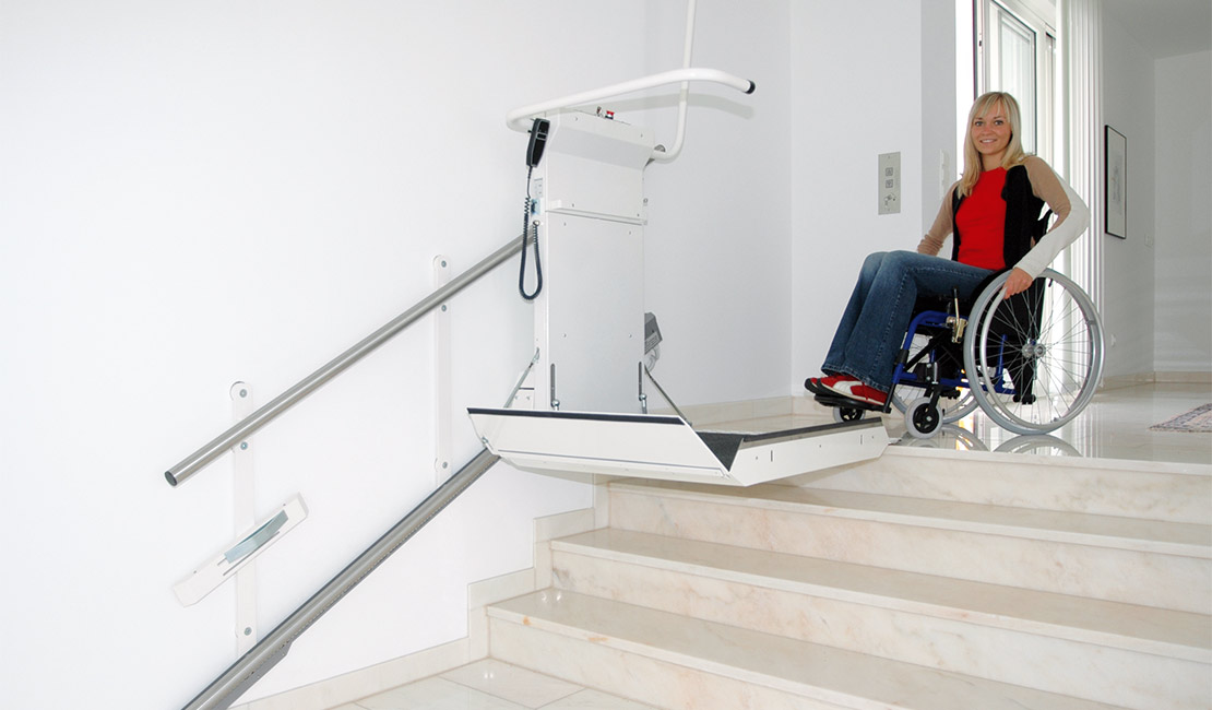 Eine junge Dame benutzt mit ihrem Rollstuhl den Plattformtreppenlift